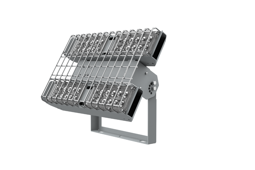 Легкий и высокоэффективный светильник с защитной решеткой на поворотной скобе для спортивных залов с высоким подвесом. Модульный корпус из листового алюминия. Вторичная оптика из акрила. Монтаж: накладной на поверхность с помощью поворотной лиры. Регулировка угла наклона от -90 до +90 градусов с шагом 30 градусов. Удобство подключения к сети питания через выведенный из светильника кабель, без разборки корпуса светильника.